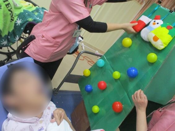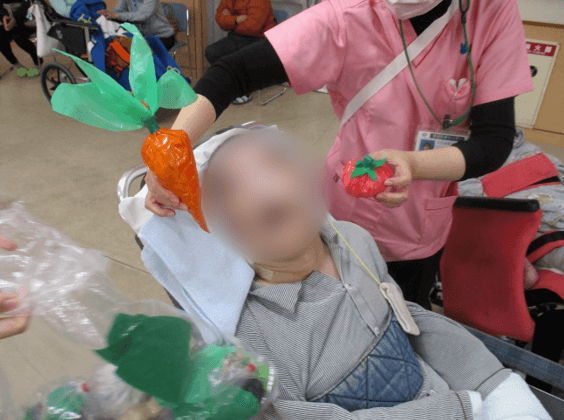 今年の冬の会では「年末年始」というところにスポットを当て、2チームに分かれて、クリスマスツリーの片づけ、野菜の詰め放題、ご家族の方のみ参加の言葉探しを行いながら除夜の鐘の回数でもある“108”点を目指して競いました。野菜の詰め放題では利用者のみなさんだけでなくご家族の方も本領発揮といった様子でたくさんの野菜をつめることが出来た!と思ったら、夏野菜も入れて得点がマイナスに…。クリスマスツリーの片づけではツリーにくっついているカラーボールを取ったり、ひもを引っ張って飾りを取ったり…。笑顔や笑い声も聞かれ賑やかな行事となりました。
