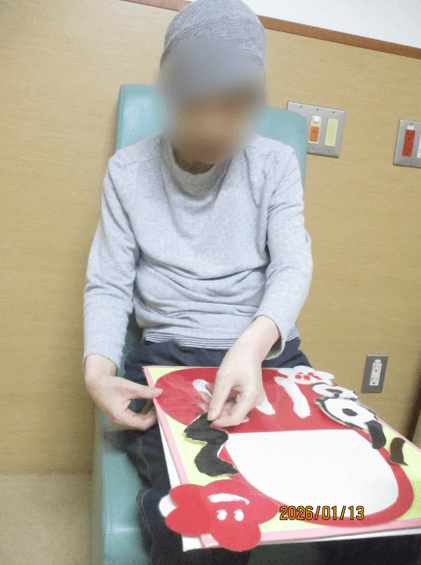 福笑いでは、腕をいっぱい伸ばしておたふくやだるまの顔を完成させていきました。皆さん真剣な様子でお顔を作っていきました。