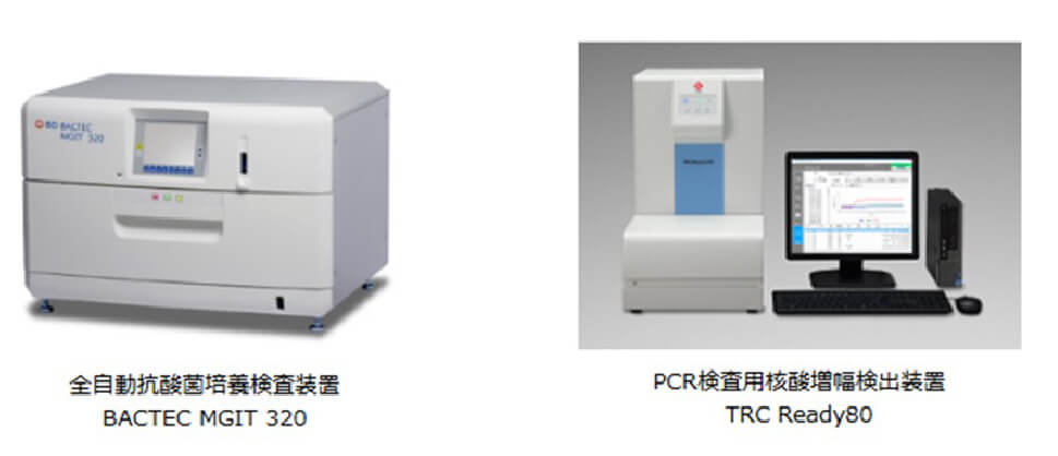 小川培地による培養では4~8週間と時間がかかるため、液体培地(MGIT)を導入し、培養時間を短縮、塗沫検査(顕微鏡で菌がいるかどうかを確認する)やPCR検査(菌の遺伝子を使った検査で少数の菌数でも検出可能)を併用することで、より早く結果を報告できる体制をとっています。