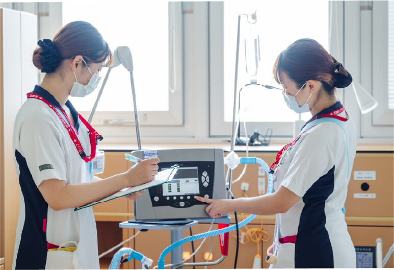 私たちは、呼吸困難感や咳・痰などの症状を緩和する看護、酸素療法や人工呼吸器・非侵襲的陽圧換気療法(NPPV)による呼吸管理を行っています。また、安全な呼吸器管理を行うために呼吸サポートチームによる、定期的なサポートを受け正しい知識を持って患者さんのケアに臨んでいます。