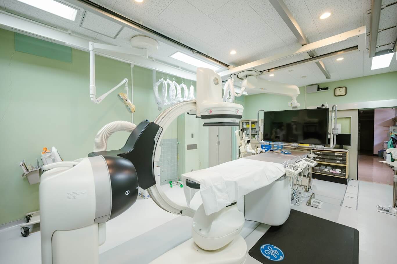 血管内にカテーテルという管を目的血管まで進めていき造影剤を使用して血管の画像を得る検査です。また、狭心症や心筋梗塞などの原因である狭くなった血管(冠動脈)を広げたり、喀血では出血の原因となる血管を塞ぐなどの治療を行ったりしています。