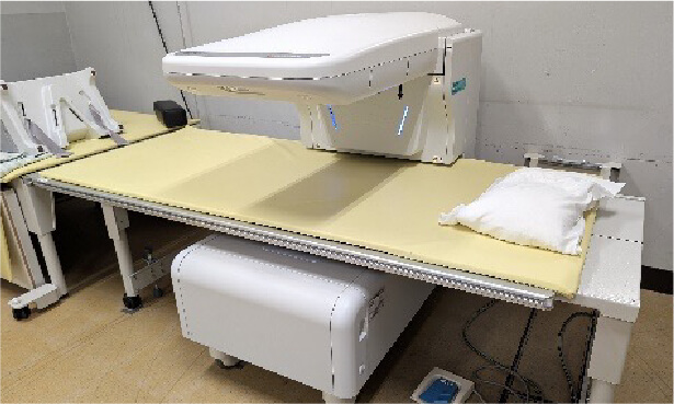 骨粗しょう症などに関連する骨密度を測定する検査です。2種類のエネルギーのX線を利用して骨の吸収値の違いから骨密度を測定します。これはDXA法(Dual Energy X-ray Absorptiometry)と言われ、最も精度の高い検査法として知られています。腰椎、大腿骨の測定を行います。