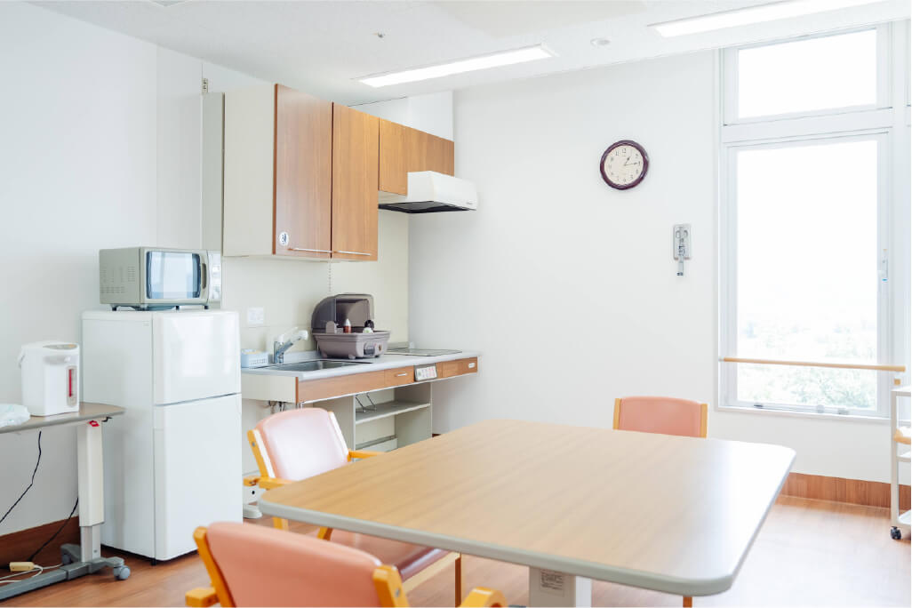 当院のリハビリテーション室は、明るく開放的な空間で、安心してリハビリに取り組める環境を整えています。広々としたスペースで安全に歩行練習や運動療法を行え、日常生活活動室では、調理や家事動作の練習を通じて退院後の生活にスムーズに戻れるようサポートします。